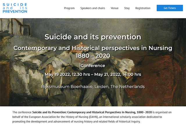The conference Suicide and its Prevention: Contemporary and Historical Perspectives in Nursing, 1880–2020 is organised on behalf of the European Association for the History of Nursing (EAHN), an international scholarly association dedicated to promoting the development and advancement of nursing history and related fields of historical inquiry. The conference organizing partners are the Knowledge Centre at the Faculty of Health, University of Applied Sciences in Leiden (dr. Cecile aan de Stegge, University of Applied Sciences Leiden, member of the EAHN) and the Pulse Network in Medical Humanities at the Vrije Universiteit Amsterdam (Prof. dr. Manon Parry, Professor in Medical History, VU University Amsterdam).